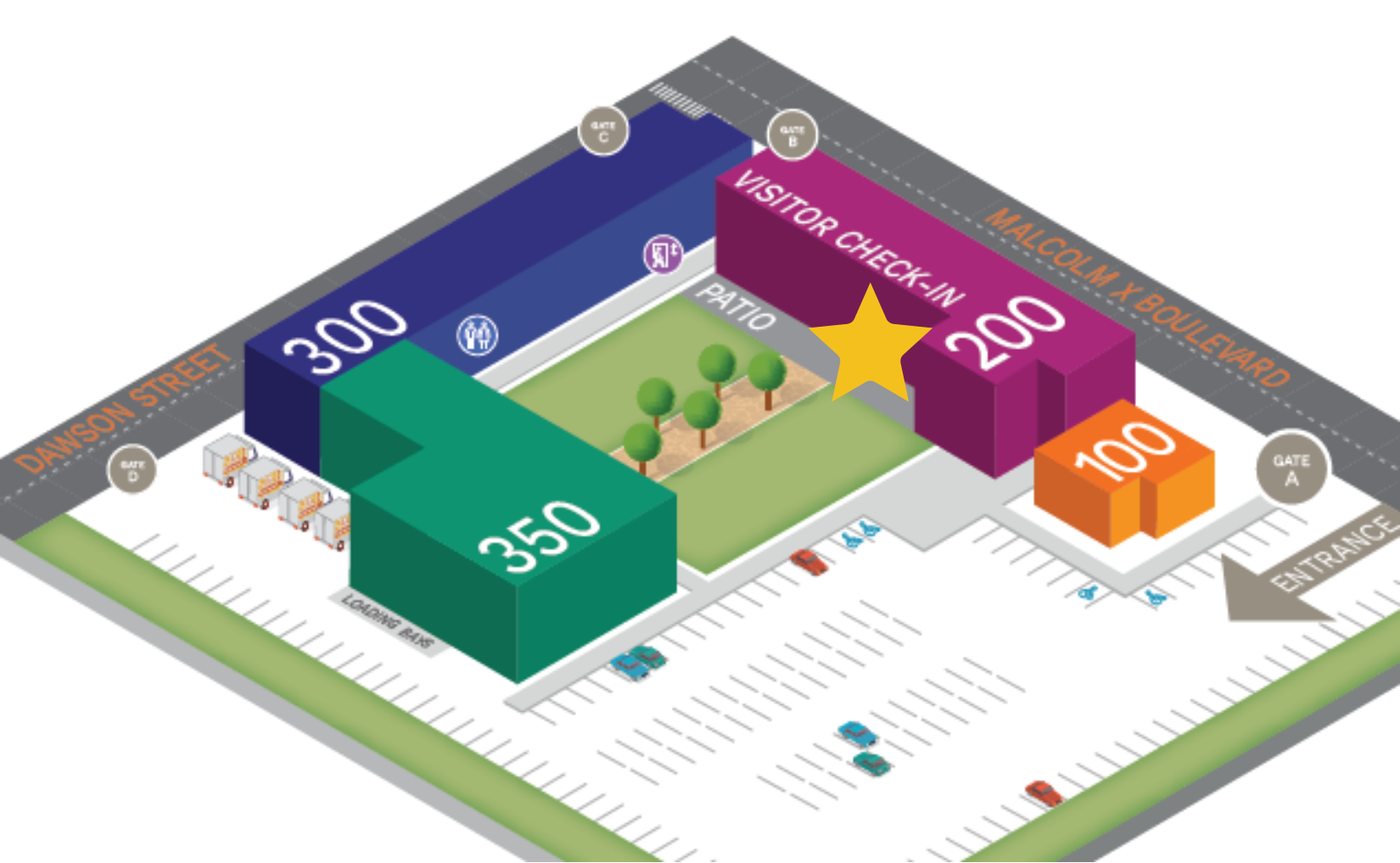 Pull into the black gate on the campus, you are welcome to park anywhere in the parking lot. Then go to just outside building 200 and a Stewpot staff person will be around the area marked with a star to get you set to volunteer.